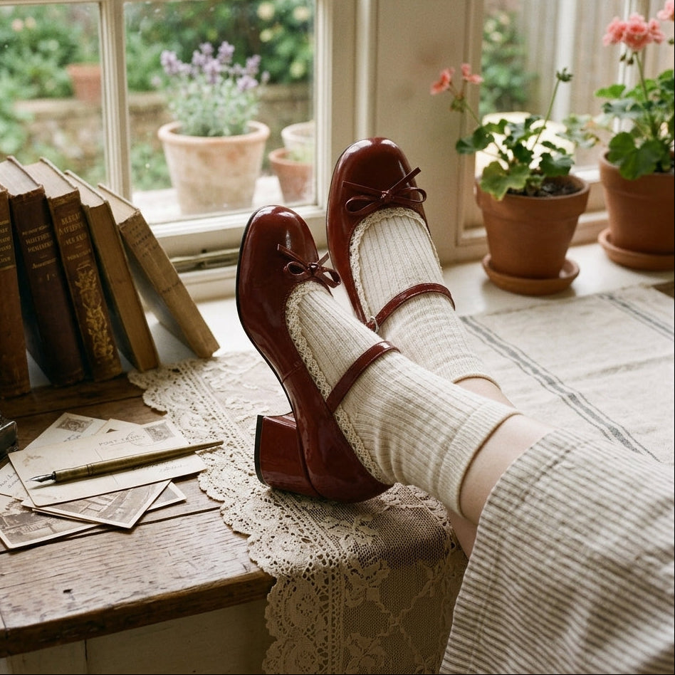 Aesthetic Red Mary Jane Lace Trim Shoes