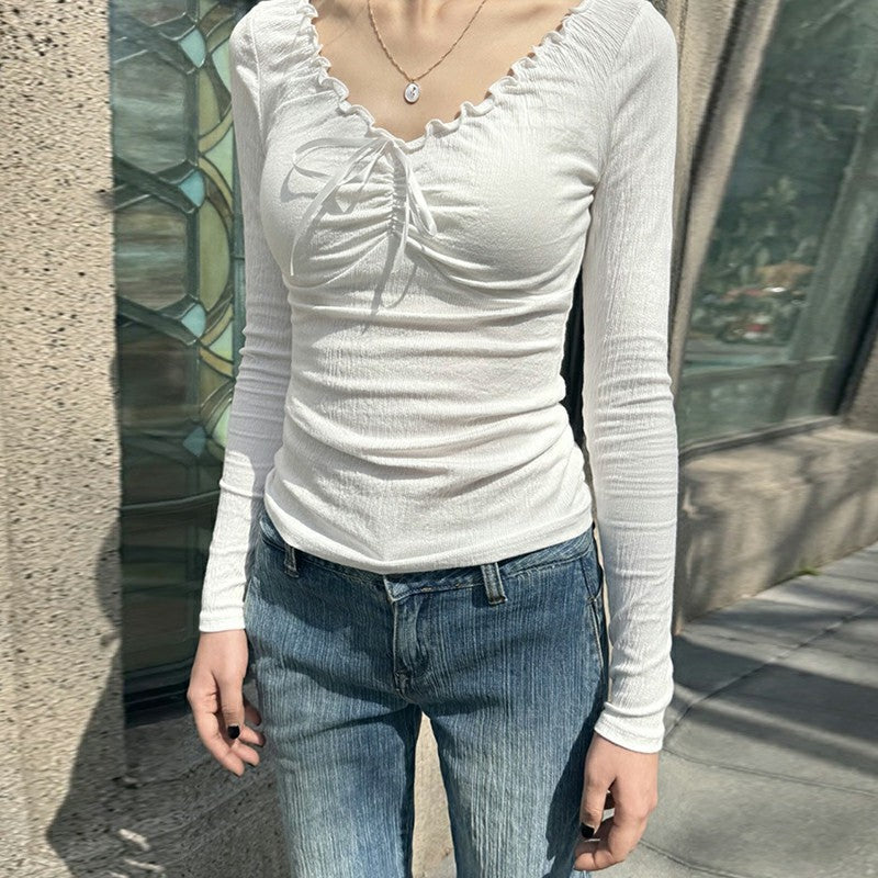 Solid Color Ruffled V-Neck Bow Long Sleeve Tee