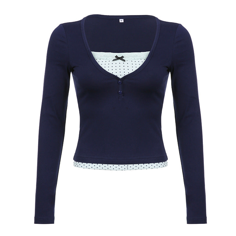 V-neck Lace Patchwork Bow Long Sleeve Tee
