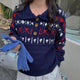 Person wearing a blue patterned sweater with red and white designs, holding blue gloves and a silver handbag.