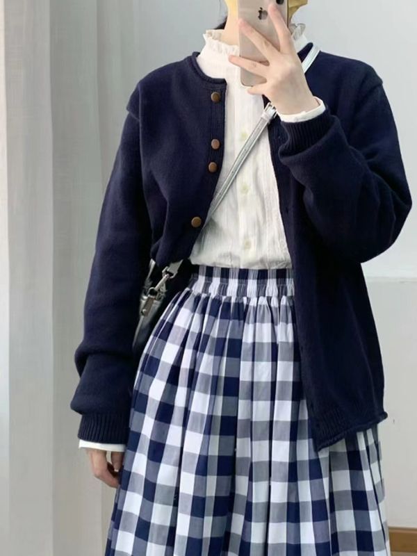 Color: shirt, navy blue cardigan (free size), blue and white tartan skirt