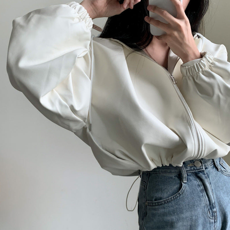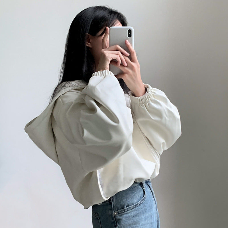 Solid Color Crop Pu Leather Hooded Jacket