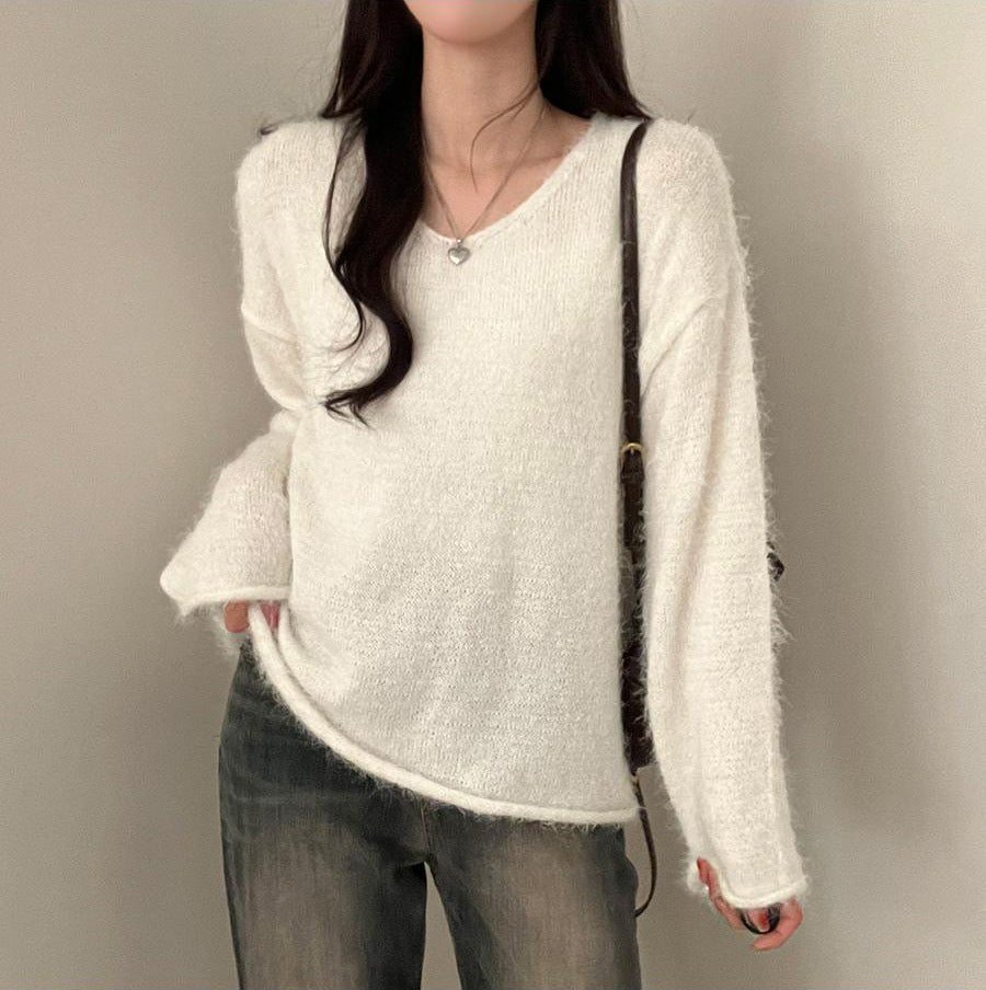 Solid Color V-Neck Fuzzy Sweater