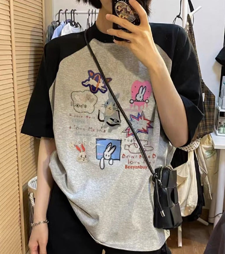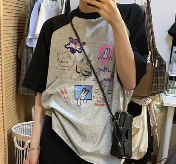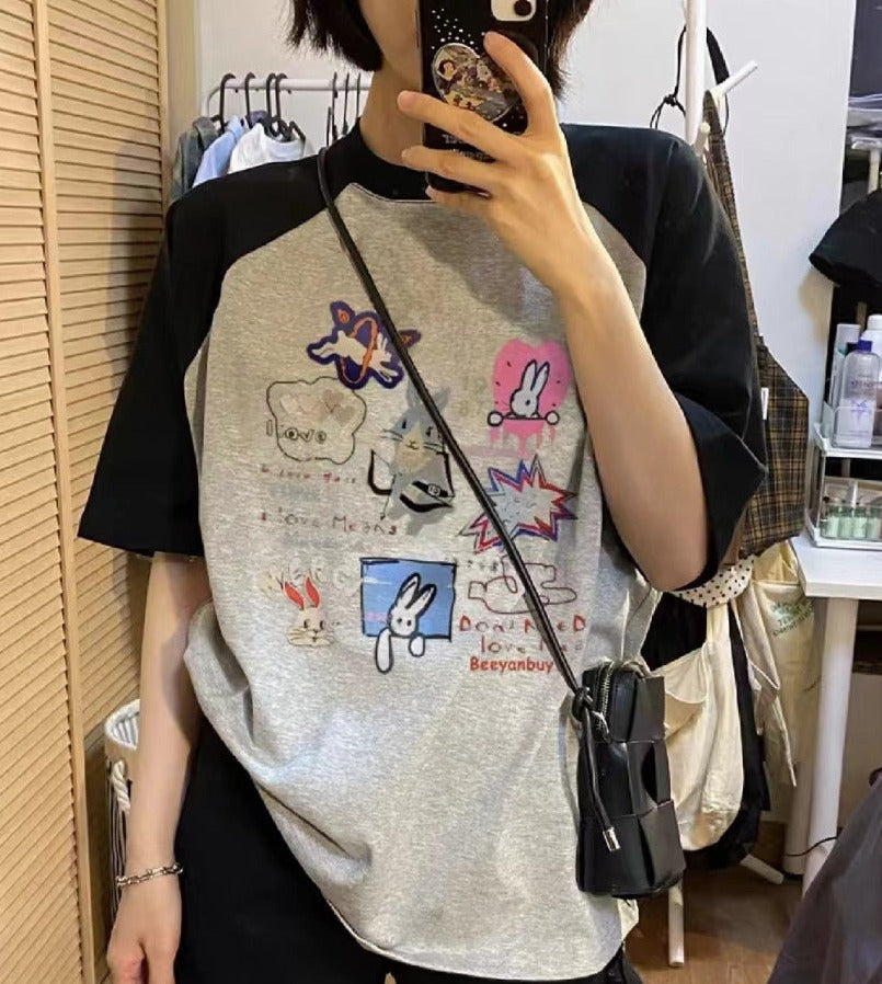 Indulge in playful charm with our Cartoon Print Raglan Short Sleeve Tee, crafted from high-quality cotton for a comfortable and stylish wear. Available in classic black with gray back collar edging, this tee seamlessly combines aesthetic, casual, and sweet styles. The raglan sleeve design adds a touch of uniqueness, while the loose fit ensures comfort for a range of sizes from M to XXL. Embrace a fusion of modern aesthetics with this must-have piece that effortlessly captures the essence of cool and playful fashion.