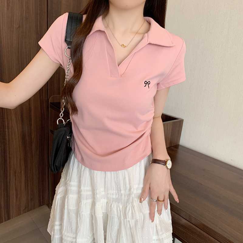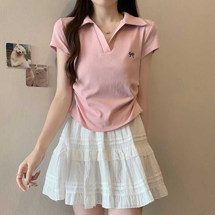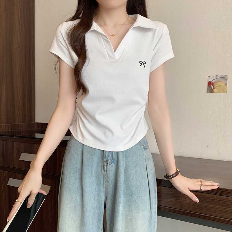 Embroidered Bow Polo Collar Short Sleeve Tee