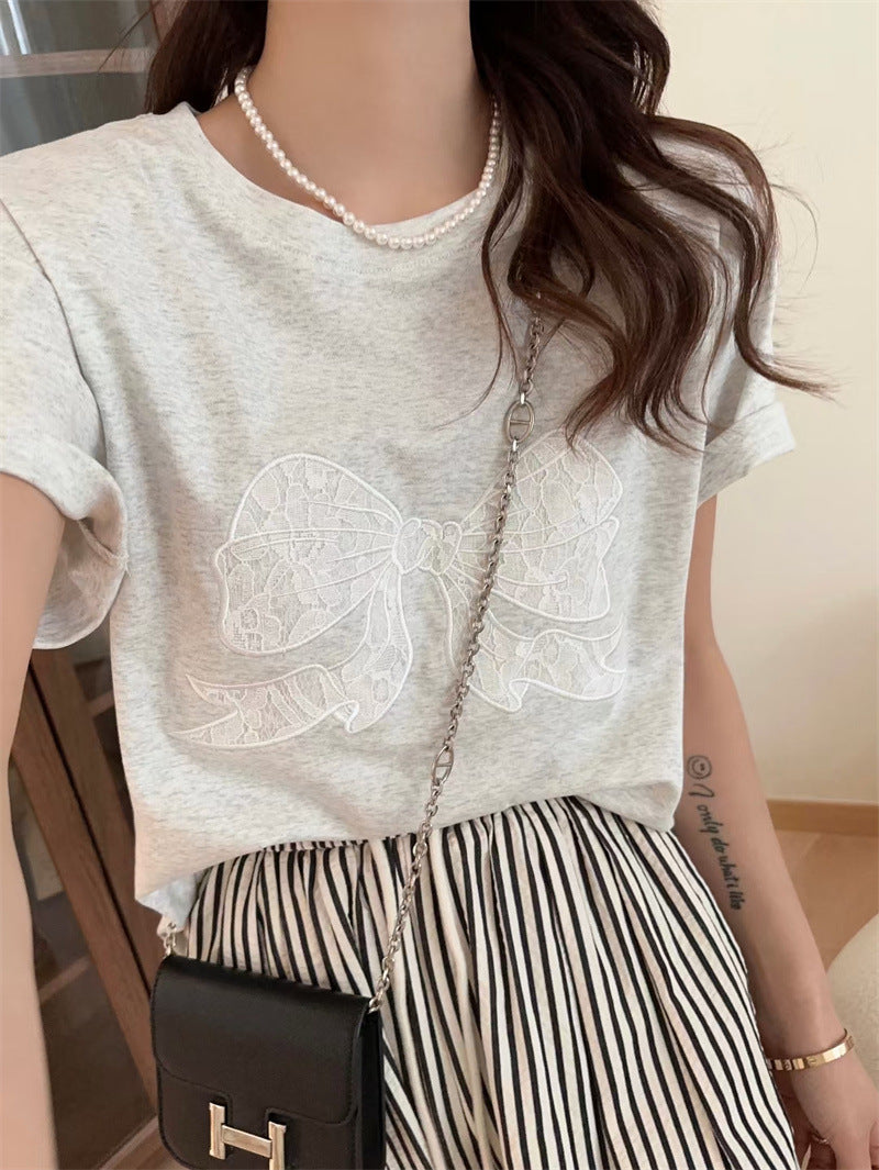 Embroidery Bow Oversized Short Sleeve Tee