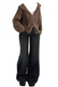 Brown knitted cardigan and black bell-bottom pants on a white background
