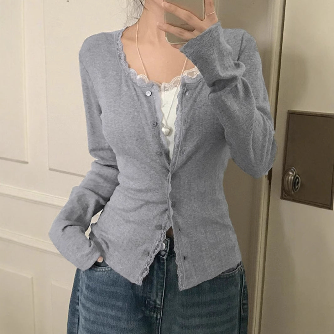 Lace Trim Long Sleeve Slim Button Knitted Tee