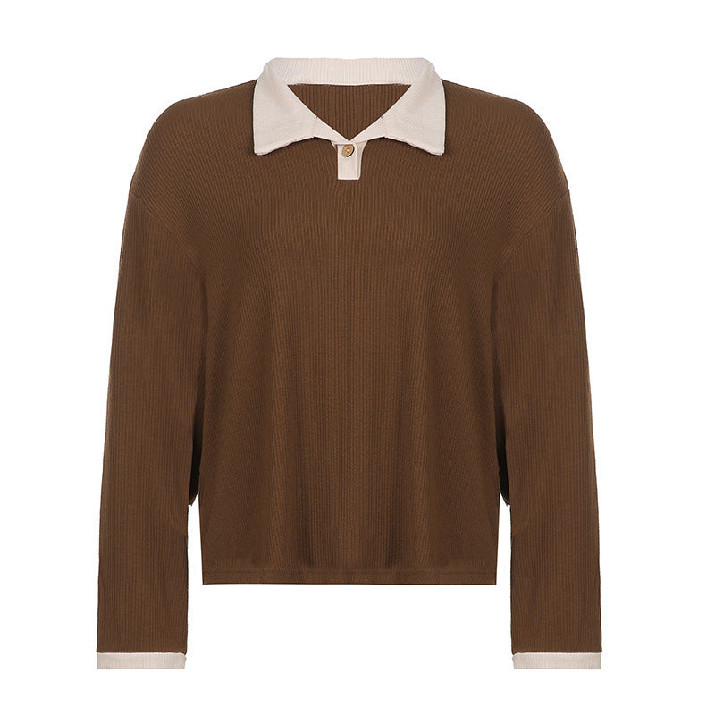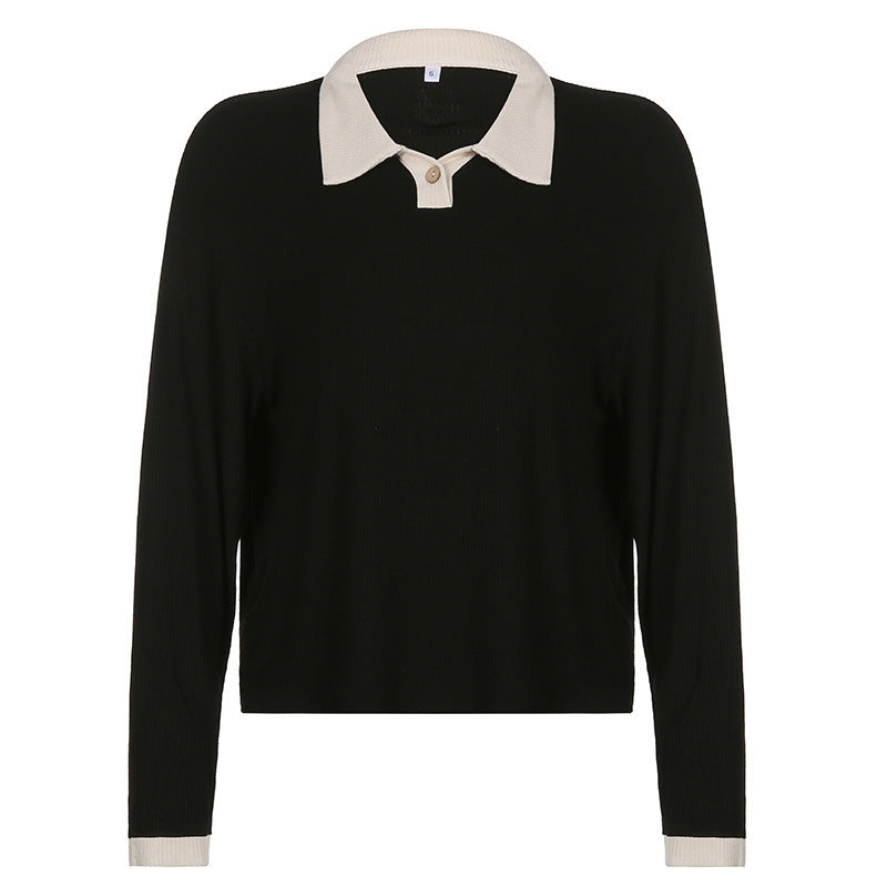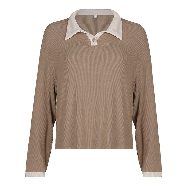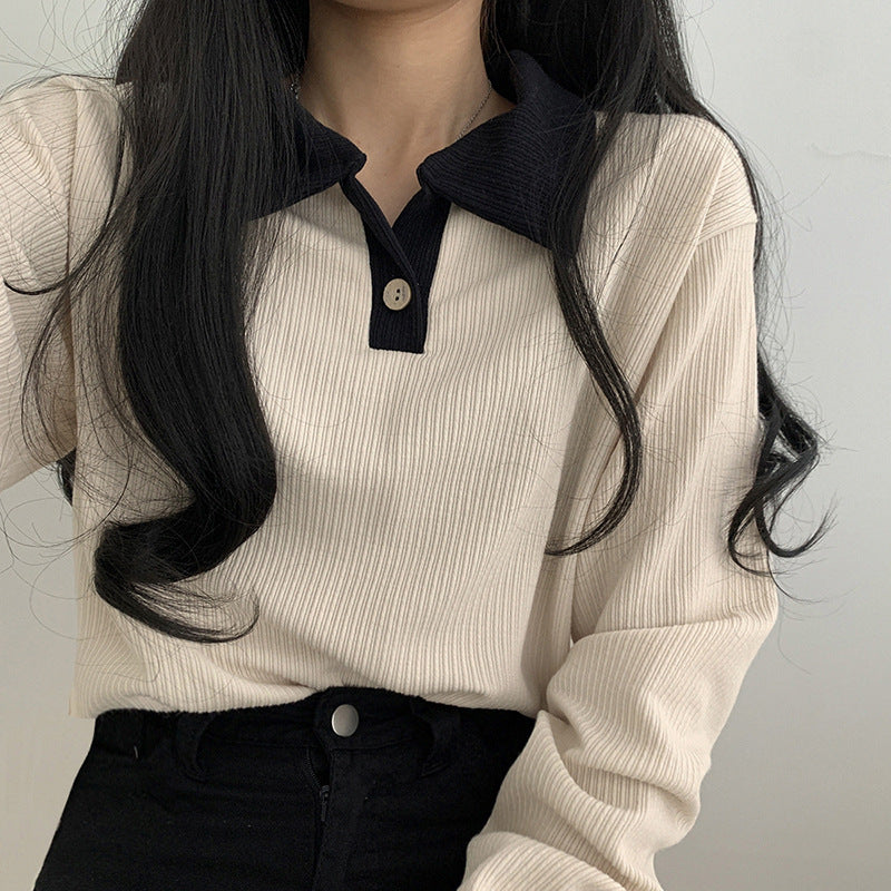 Person wearing a beige ribbed sweater with black collar and cuffs against a plain background